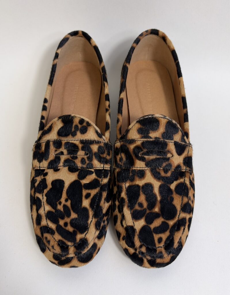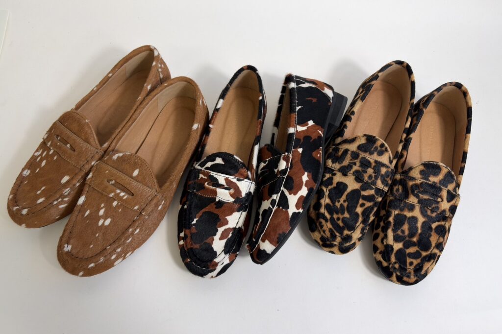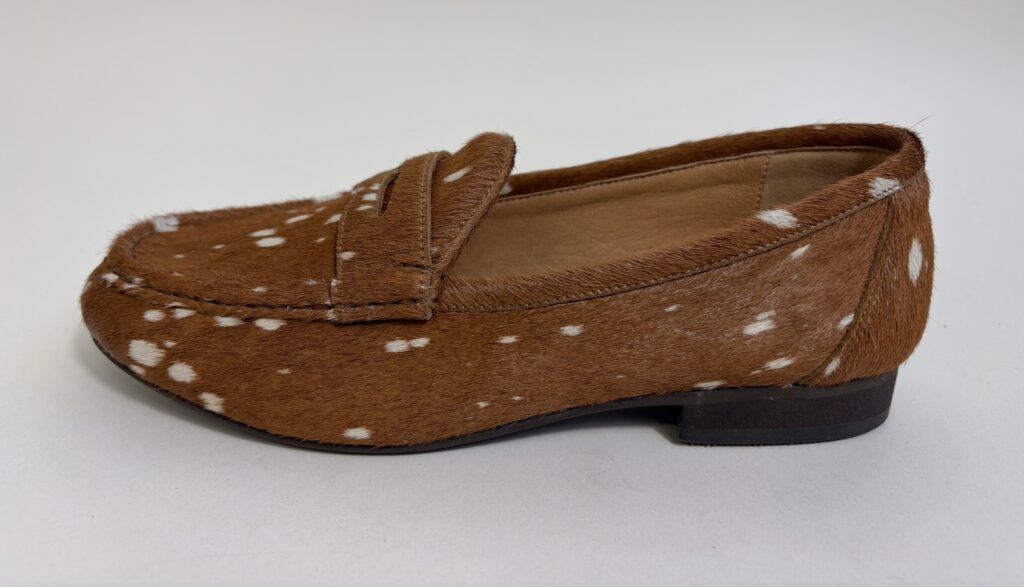 独特の光沢と滑らかな手触りが魅力のハラコ素材を贅沢に使用した一足。 トラッドなローファーデザインに、遊び心のあるアニマルプリントを施しました。