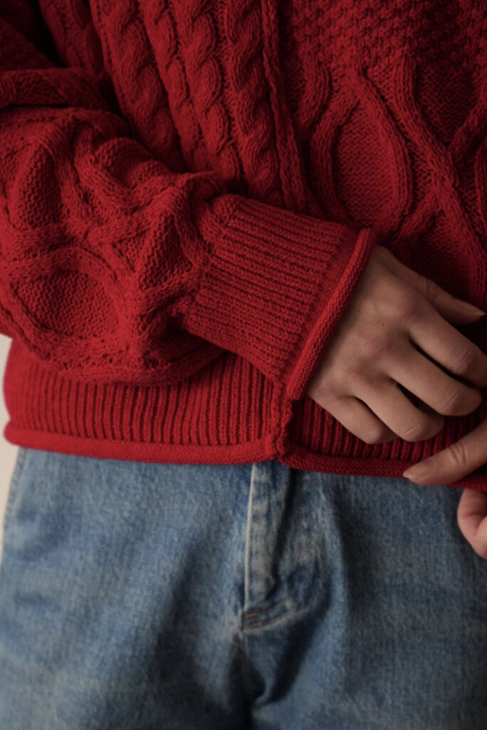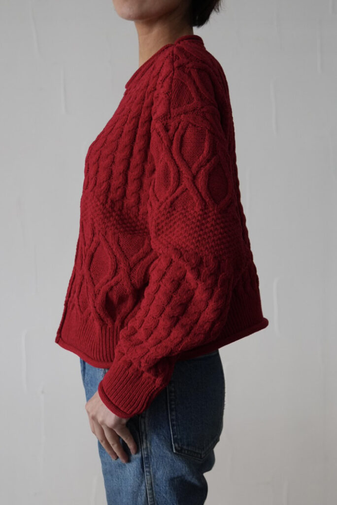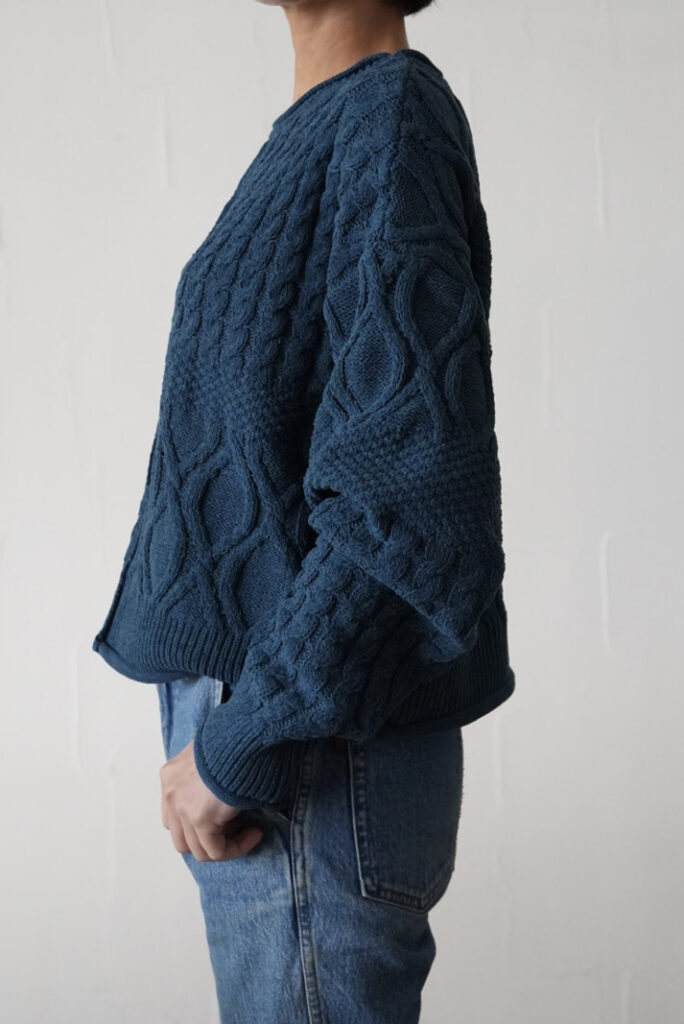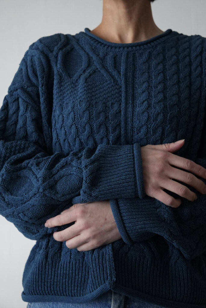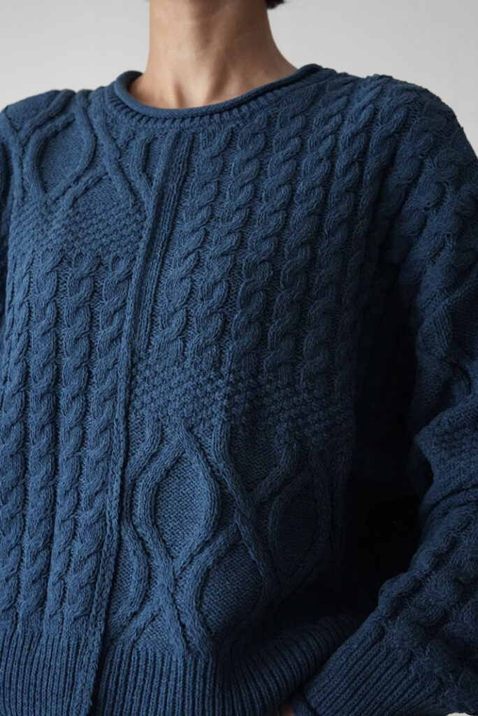 3種類の異なるケーブル編みを巧みに配置し、パッチワークのような表情豊かな編地に仕上げた超軽量5Gポリエステルニット。左右非対称な模様がアクセントになり、クラシカルながらも個性的なスタイルを演出します。