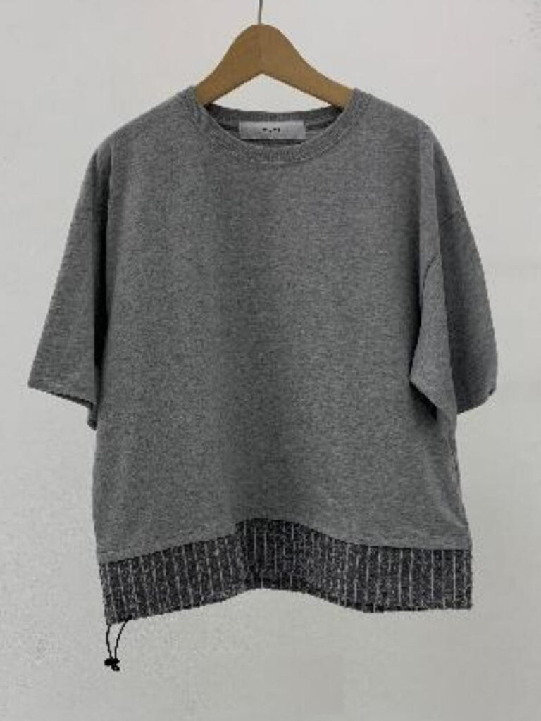 5.6ozの程よい肉厚の綿100%天竺編みカットソーとニードルパンチストライプシャツ生地のコンビネーション。ゆったりとしたフォルムです。