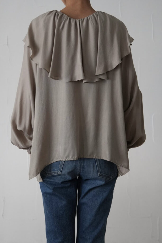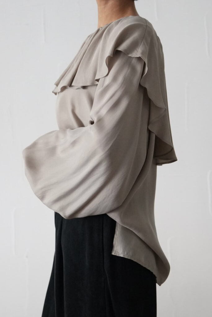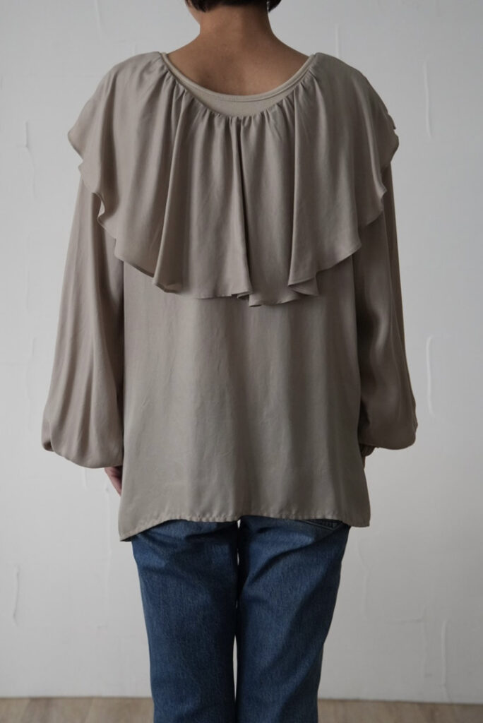 大きめラッフルながら、落ち感のあるキュプラ素材が上品。前後で異なるフリル幅は、どちらを前にしても着用できる2way仕様です。フロントの裾をインすることでこなれ感のあるコーディネートに。