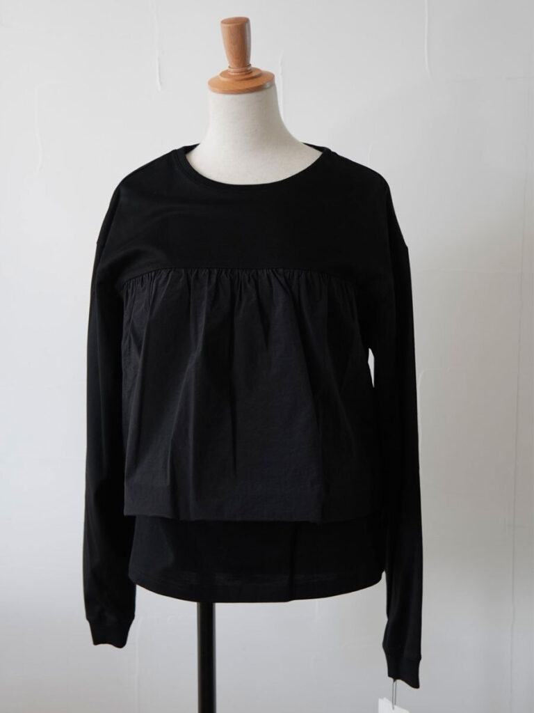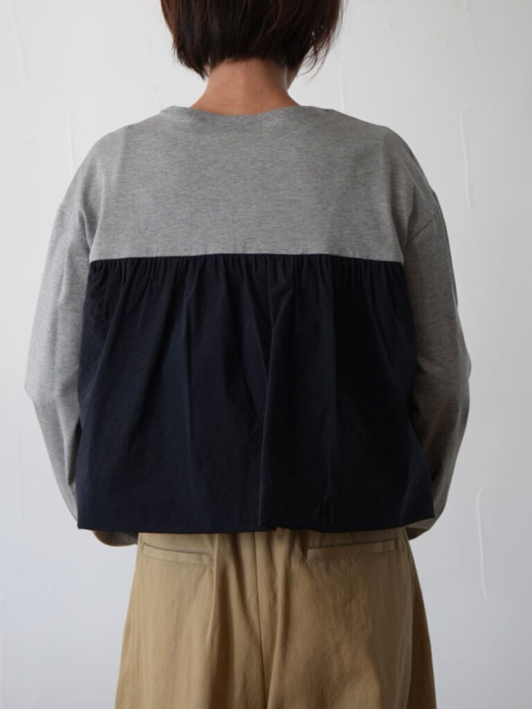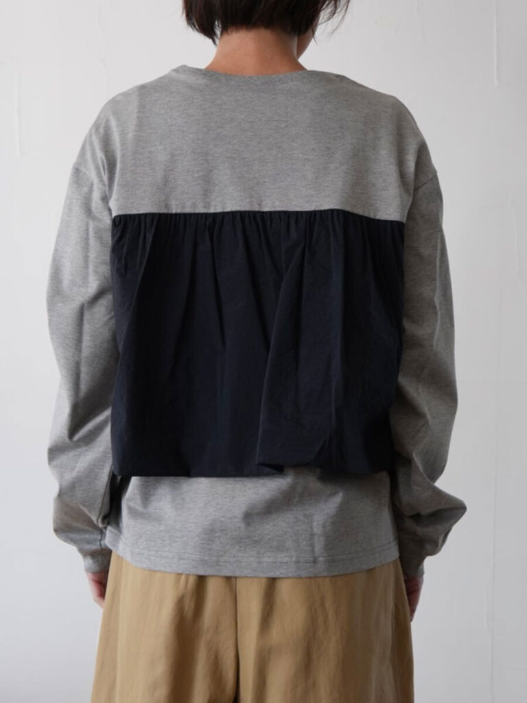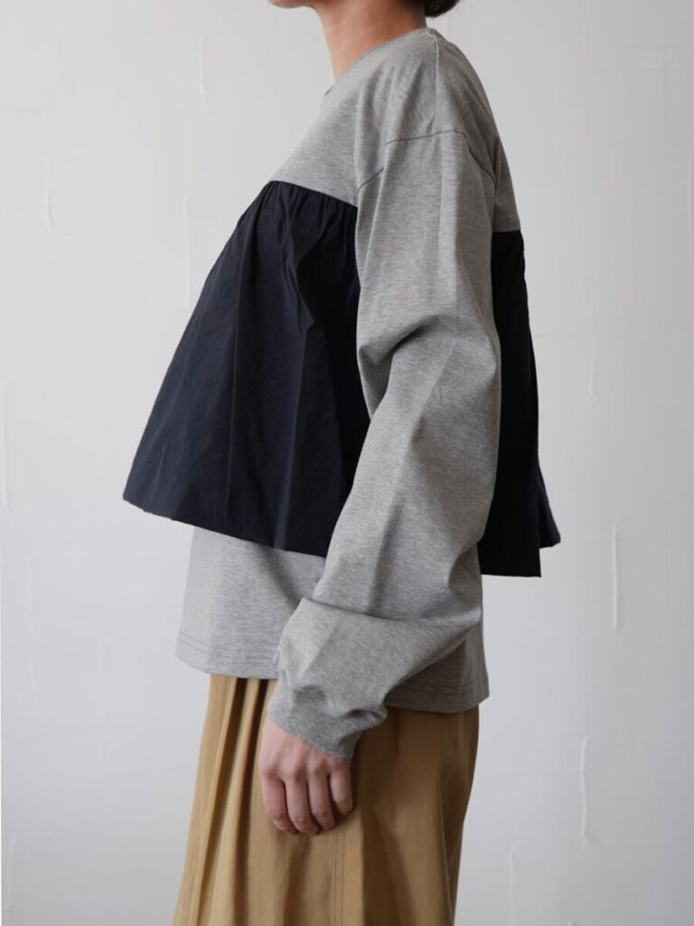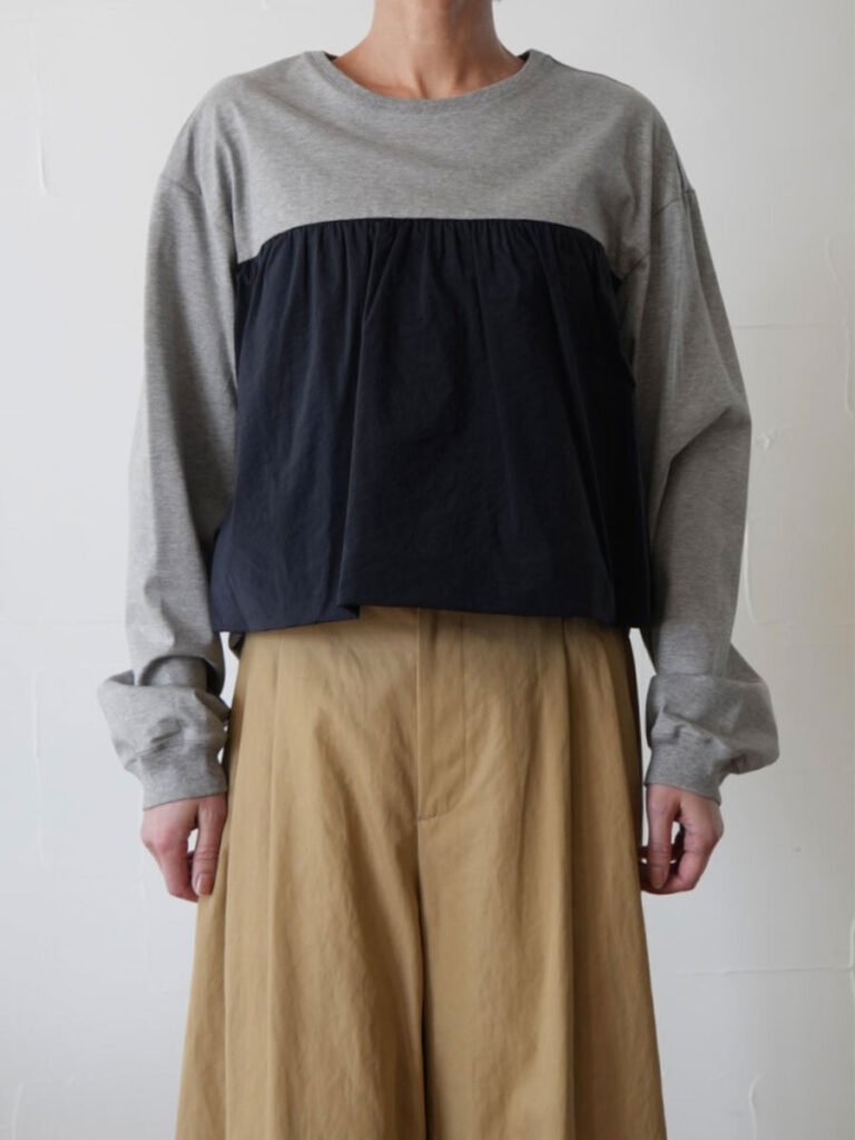 バルーンビスチェが付いたようなトップス。ベースの綿素材に対して、シアーナイロンPUの合わせが今年らしい組み合わせです。