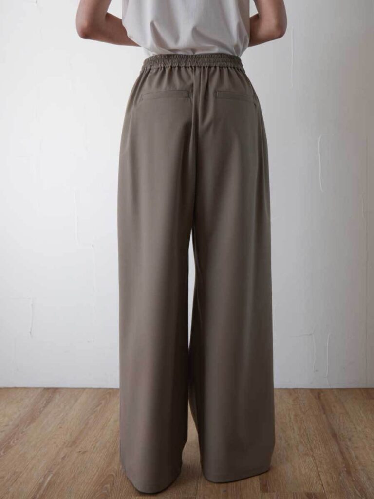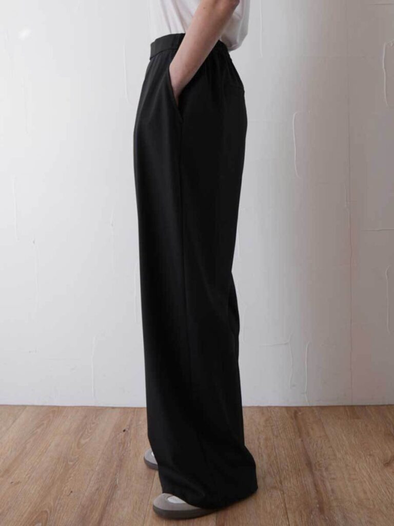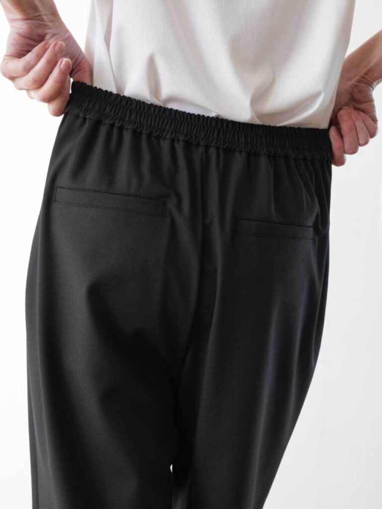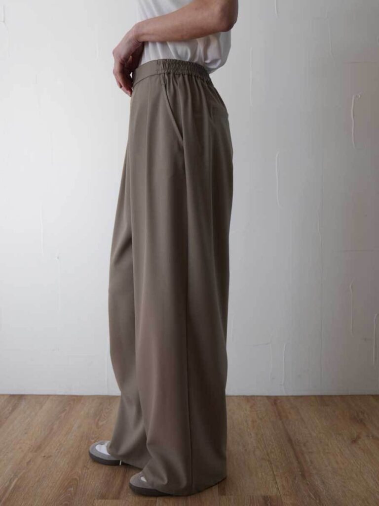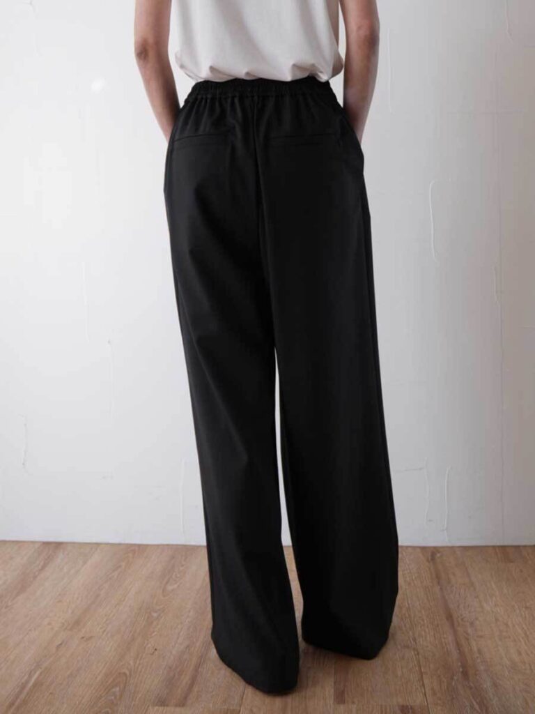 ゆったりとしたサイズ感で脚のラインをひろわず、ウエストはバックゴムで快適な履き心地のパンツです。
