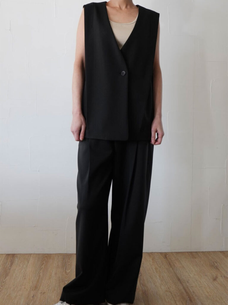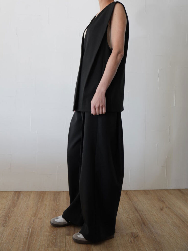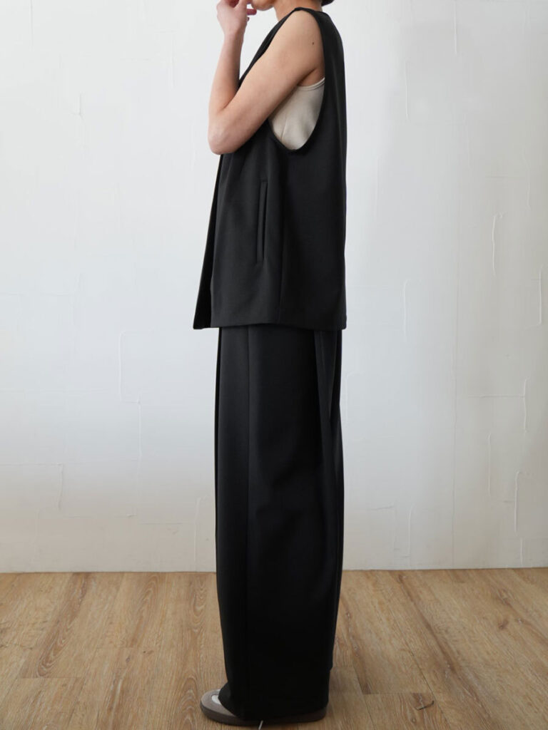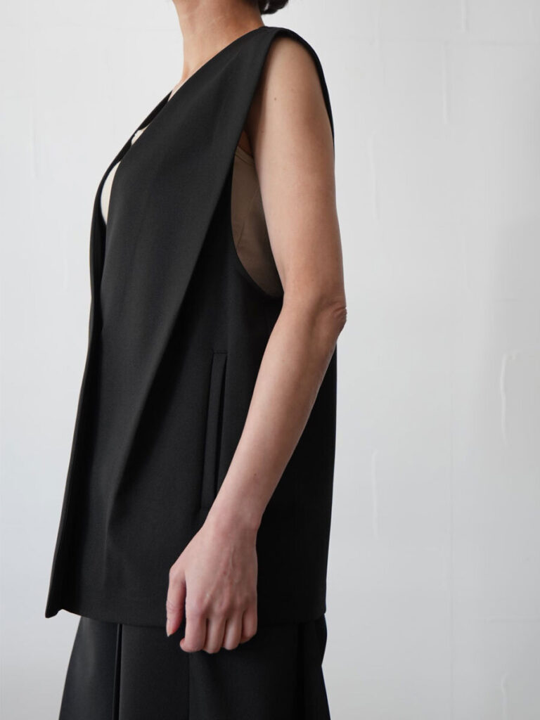 サイドのタックがポイントの無駄を削ぎ落としたミニマルなデザインが魅力のミドル丈ジレ。